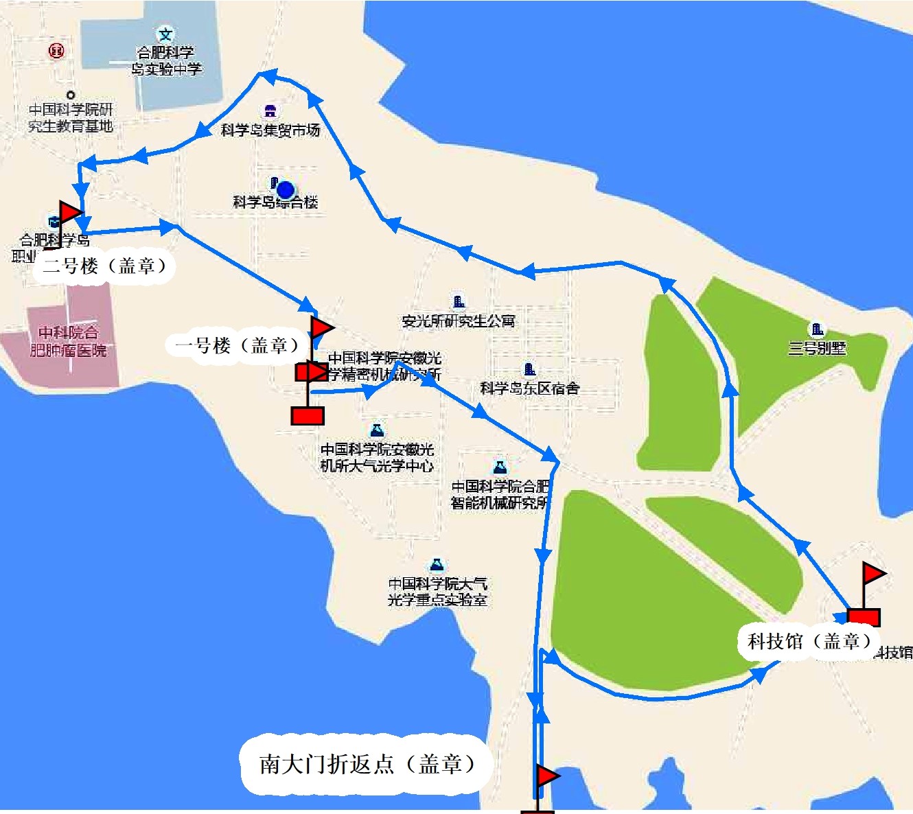 一号楼南门为起点(领牌,盖章:“五”),往东途径智能所、大桥至南大门(盖章:“十”)返回,再沿科学岛路至科技馆(盖章:“周”),途径三号别墅、科学岛集贸市场至二号楼(盖章:“年”),终点一号楼南门。