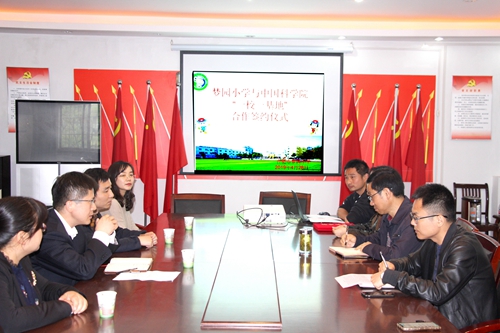 合肥市梦园小学东区副校长马路遥、合肥研究院团委副书记伍德侠代表双方签订合作协议。合肥市梦园小学东区校长邵春荣、教导处主任吴晓娟、德育副主任张超、胡珊珊老师,安徽光机所王羿博士、科普主管齐琼、孙诗华,等离子体所周能涛等同志,共同见证了双方的签约仪式。