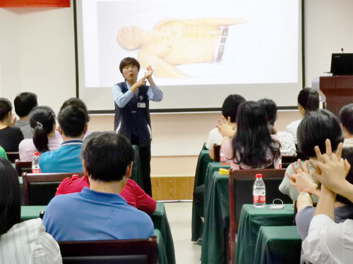 讲座中,温老师主要介绍了CPR(心肺复苏)的现场紧急救护流程、雾霾的危害及防护方法、常见职业病的预防和改善措施。并为大家普及了日常维持肌体健康的中医知识和改善措施,详细介绍了由于现代化办公方式引发的三种职业病(颈椎病、鼠标手等手部疾病、静脉曲张)的预防以及相应的穴位治疗方法。同时,通过现场演示互动,使现场人员学习掌握了针对不同情况患者心肺复苏的力度和频率,纠正了常见的急救误区;并通过现场体验展示了中医理疗技术在缓解肌体疲劳方面的疗效。