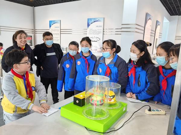 “欢迎各位来到合肥现代科技馆,我是小小志愿讲解员xxx,我来自西园新村小学南校三(4)班,今天我给大家介绍的展品是...”,将光学世界的偏振光、激光晶体、光栅光谱、真实的镜子、声控灯、辉光球等展品通过演示实验,生动有趣地将光学原理呈现给观众。