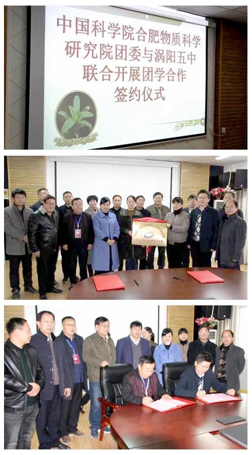 科普报告会前,中科院合肥研究院团委与涡阳五中签订团学合作框架协议。协议约定,为充分发挥合肥研究院科教资源在基础教育事业中的作用,履行合肥研究院的科学传播社会职能,广泛普及科学知识、倡导科学方法、传播科学思想、弘扬科学精神,合肥研究院团委、涡阳五中本着“资源共享,合作共赢”的原则,建立长期团学合作伙伴关系。发展 “科普拓展课程”长效机制,举办科普专家讲座;设立蒲公英科学传播教育基地,积极指导学生开展科学小实验、科学小发明等实践活动。涡阳五中校长徐文立、合肥研究院团委副书记伍德侠代表双方签订协议,涡阳县教育局副局长王森共同为蒲公英科普基地揭牌,校方领导、老师与科普专家共同见证了双方的签约揭牌仪式。