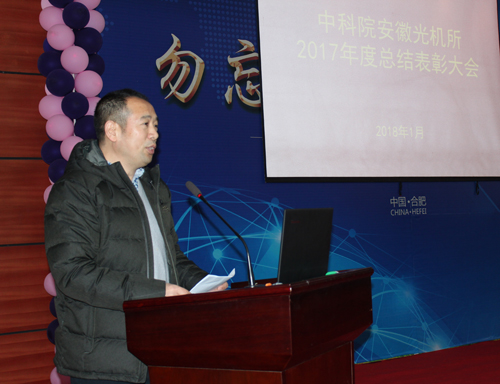 1月26日,中科院安徽光学精密机械研究所举行2017年度工作总结暨表彰大会,所领导班子、职代会代表及机关、各中心研究室干部群众近300人参加了会议。合肥研究院副院长刘建国应邀出席会议,职代会主席魏合理研究员主持了会议。