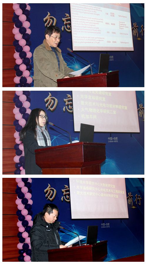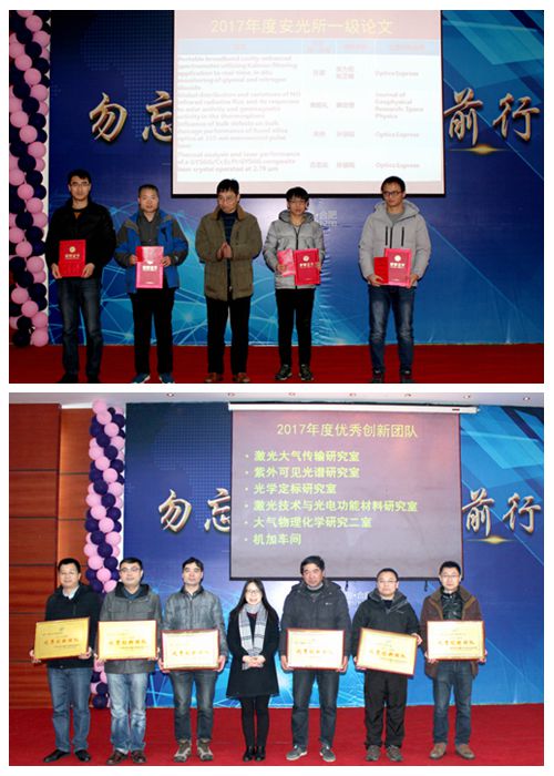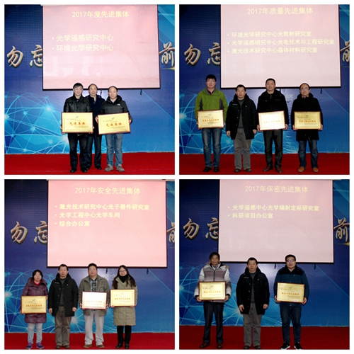 毛庆和副所长、谢品华副所长、郑小兵副所长分别宣读了2017年各项工作中取得优异成绩的单位及个人进行表彰的决定,以及优秀创新团队、优秀科研论文的获奖集体和个人。与会所领导为四位安光所一级论文第一作者,质量、保密丶安全先进集体,六个优秀创新团队(激光大气传输研究室、紫外可见光谱研究室、光学定标研究室、激光技术与光电功能材料研究室、大气物理化学研究二室、机械加工车间),二个先进集体(光学遥感研究中心、环境光学研究中心)颁发了奖状和证书。安光所2017年工作总结暨表彰大会在团结奋进的气氛中圆满落幕。