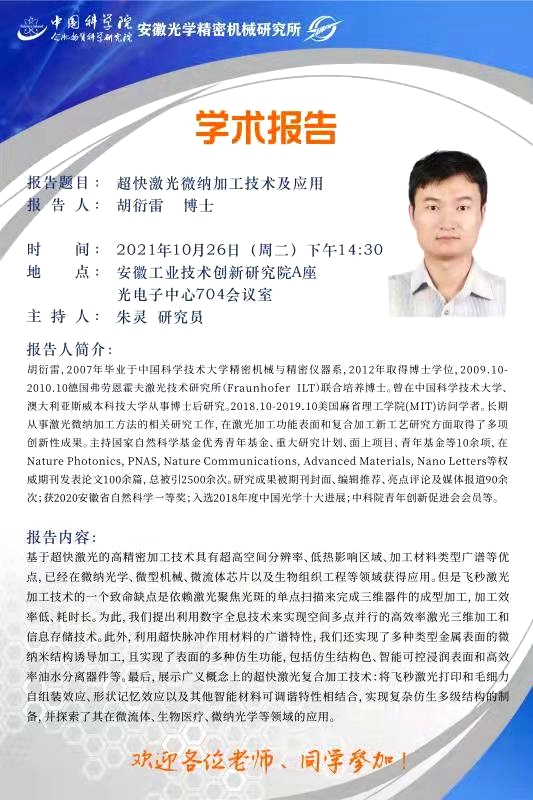 学术报告:超快激光微纳加工技术及应用(10.26)