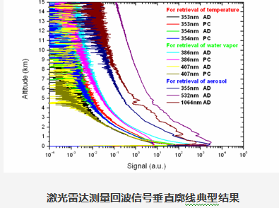 该产品融合了纯转动拉曼散射测量大气温度、振动拉曼散射测量水汽和偏振-拉曼-米散射测量大气气溶胶光学特性三种激光雷达技术和反演方法。激光雷达系统采用355nm单一波长脉冲激光作为探测光源,利用对测量波长具备高透过率的大口径光学接收望远镜收集大气后向散射光信号,后继光路通过分色片、偏振棱镜和干涉滤光片角度分色方法将353nm、354nm、355nm、386nm、407nm、532nmP、532nmS和1064nm回波光信号相互分开探测。利用测量的353nm和354nm大气分子纯转动拉曼散射高低阶谱线光信号用于反演得到大气温度廓线,利用测量的386nm和407nm大气氮气分子和水汽分子振动拉曼散射光信号用于反演得到大气水汽廓线,利用测量的532nmP和532nmS气溶胶米散射平行和垂直偏振分量用于反演得到大气气溶胶退偏振比廓线,利用测量的386nm大气氮气分子拉曼散射和355nm、532nm和1064nm气溶胶米散射光信号用于反演得到大气气溶胶光学特性廓线。测量结果显示:该激光雷达的时间分辨率为5分钟,空间分辨率为7.5米,可同时测量近地面至10km高度范围内大气温度、水汽和气溶胶消光系数垂直廓线。大气温度测量精度为±2k,水汽测量精度为±1g/kg,气溶胶消光系数测量精度为±0.1km-1。同时,该系统为车载型,结构紧凑,便于移动,在保护天窗测量状态下具备全天候无人值守测量能力,便于开展外场试验,适合气象、环保和科研院所等部门对于大气温度、水汽和气溶胶进行业务化观测。
