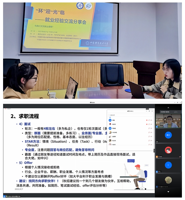 为了帮助毕业生们更好的就业,4月7日晚7点,安光所研会和环光学院研究生会联合举办了就业分享交流会。会议邀请了4位优秀的2021届毕业生代表来分享自己的就业经验。本次线上网络会议共有140余人线上参会。